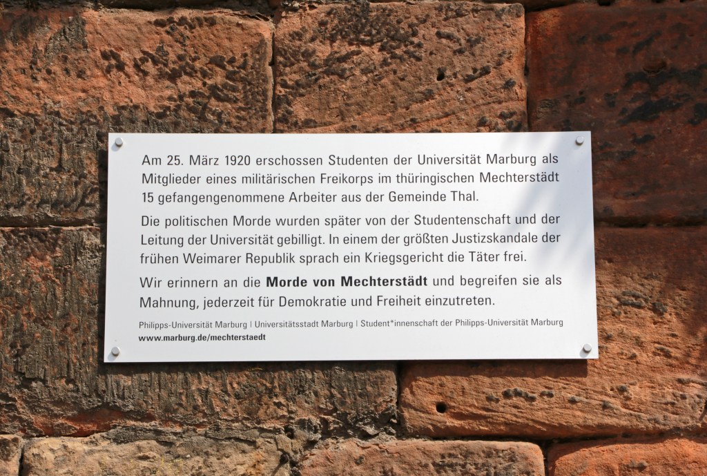 Als im März 1920 der Kapp-Putsch stattfand, ein Staatsstreich, in dem konservative und rechtsextreme Gruppierungen die Regierung der Weimarer Republik stürzen wollten, breiteten sich Unruhen in verschiedenen Teilen des Reiches aus. Auch in Thüringen kam es zu Kämpfen zwischen den Befürwortern des gescheiterten Staatsstreiches und der organisierten Arbeiterschaft, die in den Streik trat. Zur Niederschlagung der Streiks wurde nicht nur die Reichswehr eingesetzt, sondern auch korporierte (in Burschenschaften organisierte) Studenten. Studenten des nationalistischen „Marburger Studentenkorps“ reisten ebenfalls nach Thüringen. Am 25. März nahmen die Marburger Studenten 15 Arbeiter gefangen und erschossen sie auf dem Weg nach Mechterstädt. Die politischen Morde, die später als „Morde von Mechterstädt“ erinnernt wurden, wurden von der Studentenschaft und der Universitätsleitung gebilligt. Die Studenten wurden in dem darauf folgenden Gerichtsprozess freigesprochen – was in linken Medien scharf verurteilt wurde. Die politische Stimmung wurde zunehmend angespannter. Eine Gedenktafel erinnert heute an der Alten Universität an die Morde.