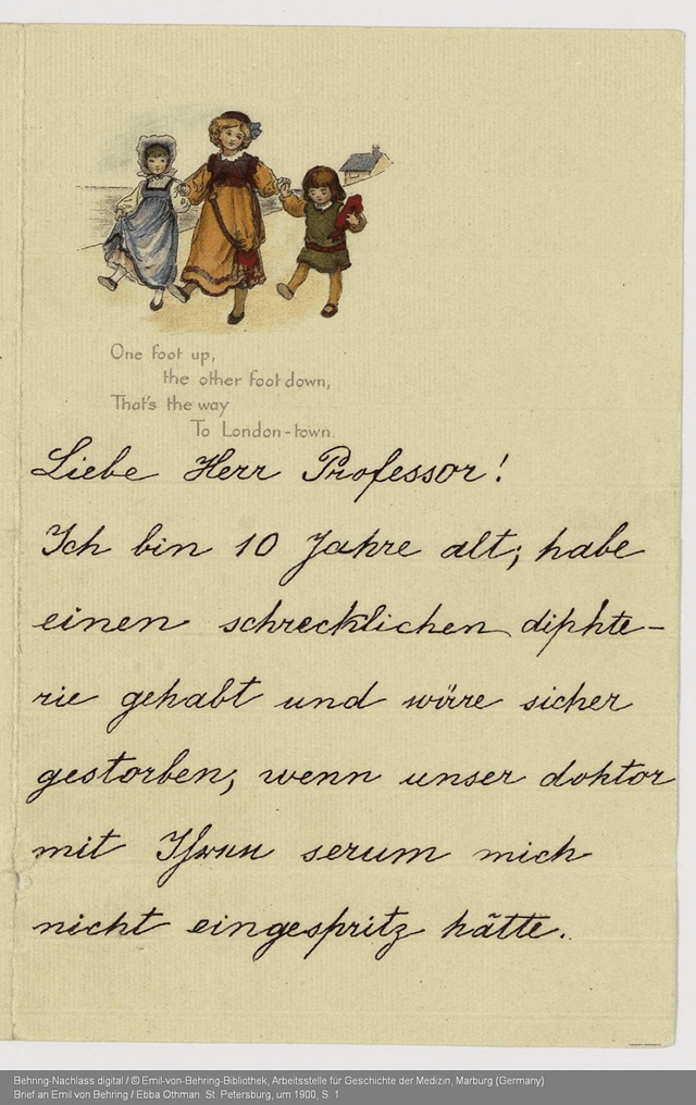 Ich bin 10 Jahre alt; habe einen schrecklichen diphtherie gehabt und wäre sicher gestorben, wenn unser doktor mit Ihrem serum mich nicht eingespritz hätte.