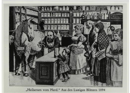 Gereinigtes und haltbar gemachtes Pferdeserum mit Antikörpern war schließlich das Mittel der Wahl bei der Behandlung der Diphtherie. Die Heilserumtherapie war erfunden, das Pferd wurde zum Heilmittelproduzenten.[8] Auch die Presse verfolgte diese medizinische Entwicklung in Wort und Bild.