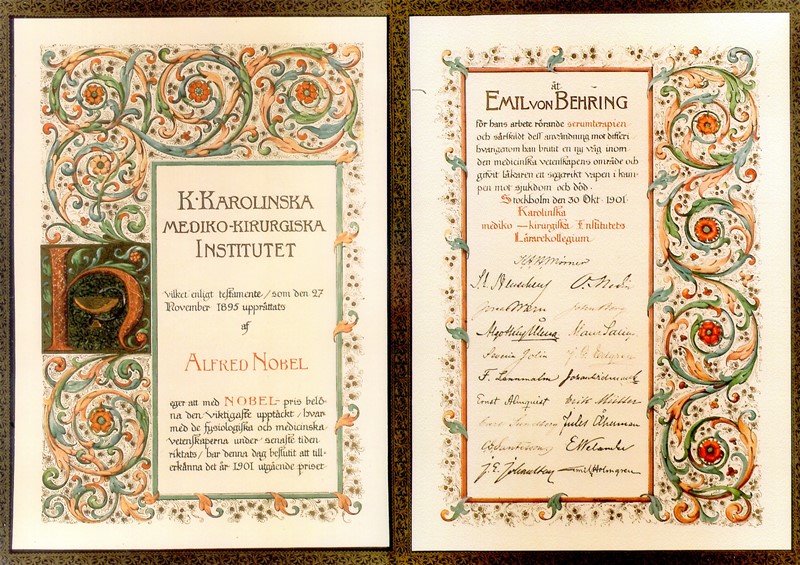 Am 10. Dezember 1901 erhielt Behring gegen starke Konkurrenz den erstmals vergebenen Nobelpreis für Medizin oder Physiologie. Auf der Urkunde ist nicht nur zu lesen, dass er die Auszeichnung für die Entwicklung des Diphtherieserums erhielt, sondern auch für das neuartige Heilprinzip der passiven Immunisierung. Mit der Antikörpertherapie hatte er einen neuen Weg in den medizinischen Wissenschaften eingeschlagen („en ny väg inom den medicinska vetenshapens“) und neue Heilungsmöglichkeiten eröffnet.