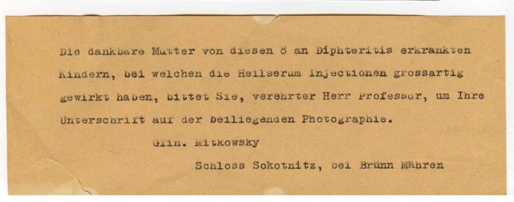 Unter den fast tausend Briefen, die Else von Behring[1] im Verlauf ihrer Ehe mit Emil von Behring sammelte und für die Nachwelt aufbewahrte,[2] gehört auch dieses Konvolut von Dankesschreiben. Es handelt sich um eine bunte Mischung aus Postkarten und Weihnachtsgrüßen, Telegrammen und Briefen, denen manchmal auch Kinderfotos, Zeitungsausschnitte, Gedichte oder Bargeld beigelegt wurden. Zu den kuriosesten Geschenken gehörte sicherlich die Übersendung von fünfzig Eiern. Die Post nach Marburg kam aus ganz Deutschland, aber auch aus dem europäischen Ausland und aus Übersee: aus Padua, Palermo, Rom, St. Petersburg, Neapel, Rostow am Don, Budapest, Moskau, dem Engadin, Pittsburgh oder Buenos Aires. Die Absenderinnen und Absender priesen den Erfinder der Serumtherapie und dankten für die Rettung ihrer Kinder, die dank Behrings Diphtherieheilserum wieder gesund geworden waren.