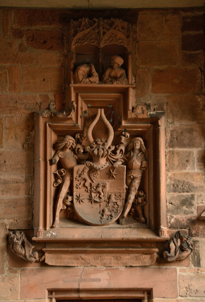 Eine ganz ähnliche Textstelle findet sich in Die Günderode (1840).[10] Das Wappenrelief, von dem sie spricht, befindet sich übrigens am Wilhelmsbau des Schlosses und zeigt natürlich nicht Elisabeth und Philipp, sondern den Bauherrn des Wilhelmsbaus, Landgraf Wilhelm III., und seine MutterAnna von Katzenelnbogen.