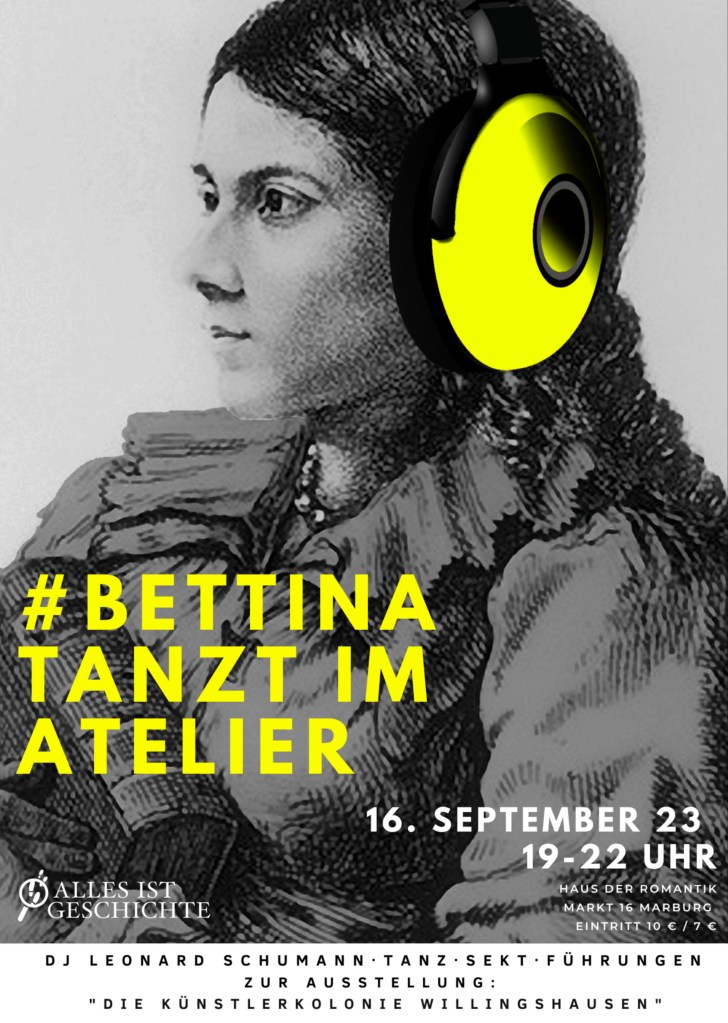 Unser Tanz durchs Museum geht in die zweite Runde! Zusammen mit dem Marburger Haus der Romantik Marburg laden wir Euch am 16. September 2023 herzlich zur Veranstaltung #Bettina tanzt im Atelier ein. Bei elektronischer Musik vom Marburger DJ Leonard Schumann und Getränken bieten wir in besonderer Atmosphäre Führungen durch die Dauerausstellung und die aktuelle Sonderausstellung „Die Künstlerkolonie Willingshausen“ an. Wir freuen uns auf Euch!